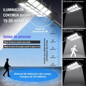 - Tecnología inteligente: Sensor de movimiento, control remoto y 3 modos de iluminación (bajo, medio, alto).