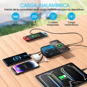 Con su batería de alta capacidad, este power bank puede darle vida hasta a 6 dispositivos al mismo tiempo. ¿Tu smartphone, smartwatch y audífonos se descargaron al mismo tiempo? No hay problema. Incluso puedes cargar tu teléfono sin cables gracias a su base inalámbrica Qi de 15W. Solo colócalo y ¡listo!
