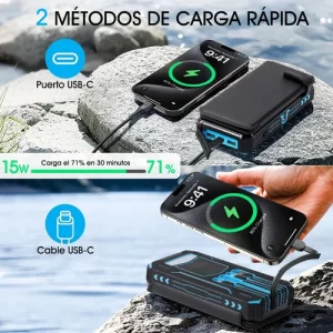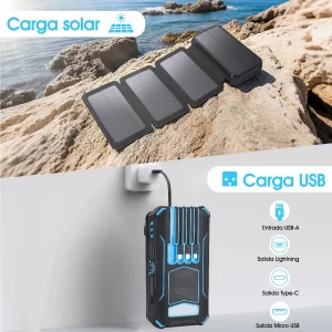 Incorpora 4 paneles solares plegables, que cargan 4 veces más rápido que los modelos convencionales. Ideal para senderismo, campamentos, ciclismo o simplemente para evitar quedarte sin batería durante un apagón. No solo es portátil, es autosuficiente.